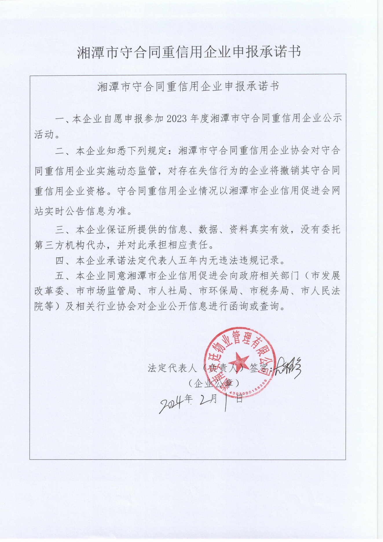 本企業(yè)根據(jù)《湘潭市守合同重信用企業(yè)申報(bào)規(guī)定》等編制 2023 年度企業(yè)信用報(bào)告書,并保證本報(bào)告書內(nèi)容真實(shí)、準(zhǔn)確、完整。