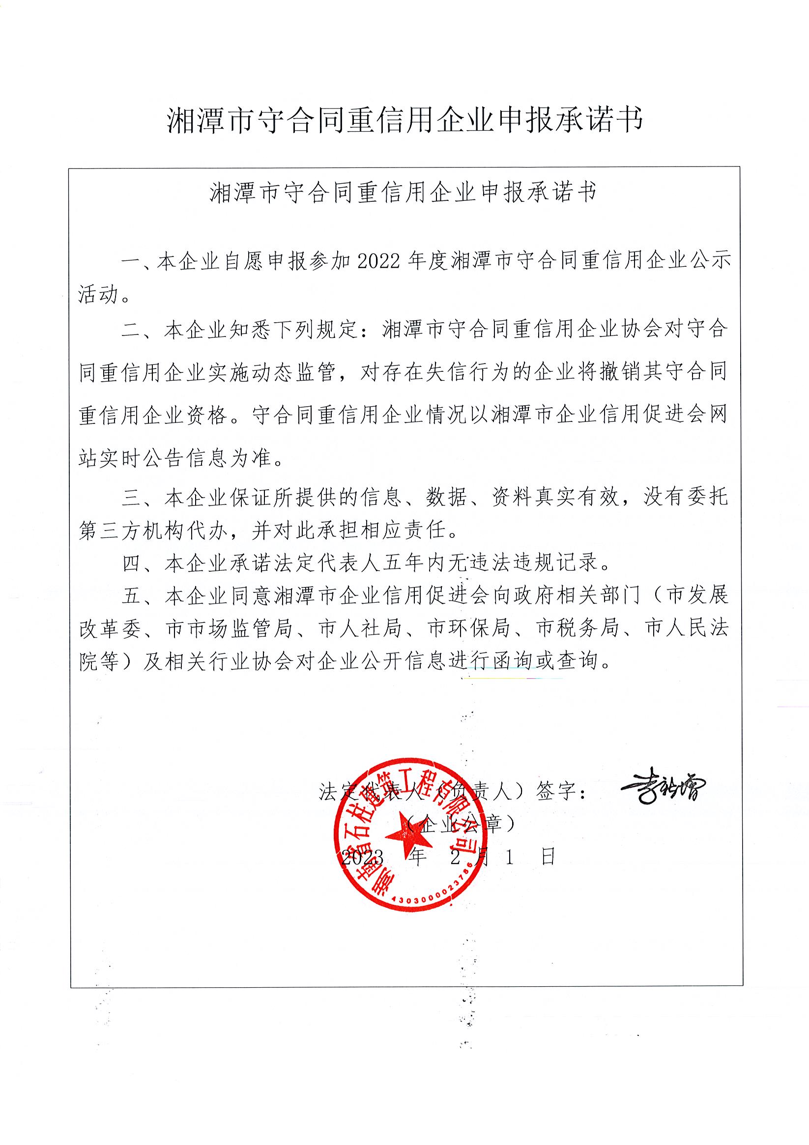 本企業(yè)根據(jù)《湘潭市守合同重信用企業(yè)申報(bào)規(guī)定》等編制 2022 年度企業(yè)信用報(bào)告書,并保證本報(bào)告書內(nèi)容真實(shí)、準(zhǔn)確、完整。
