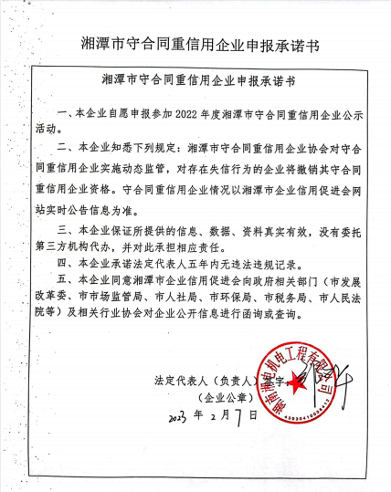 本企業(yè)根據(jù)《湘潭市守合同重信用企業(yè)申報規(guī)定》等編制 2022 年度企業(yè)信用報告書,并保證本報告書內(nèi)容真實、準確、完整。