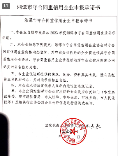 本企業(yè)根據(jù)《湘潭市守合同重信用企業(yè)申報規(guī)定》等編制 2023 年度企業(yè)信用報告書,并保證本報告書內(nèi)容真實、準確、完整。