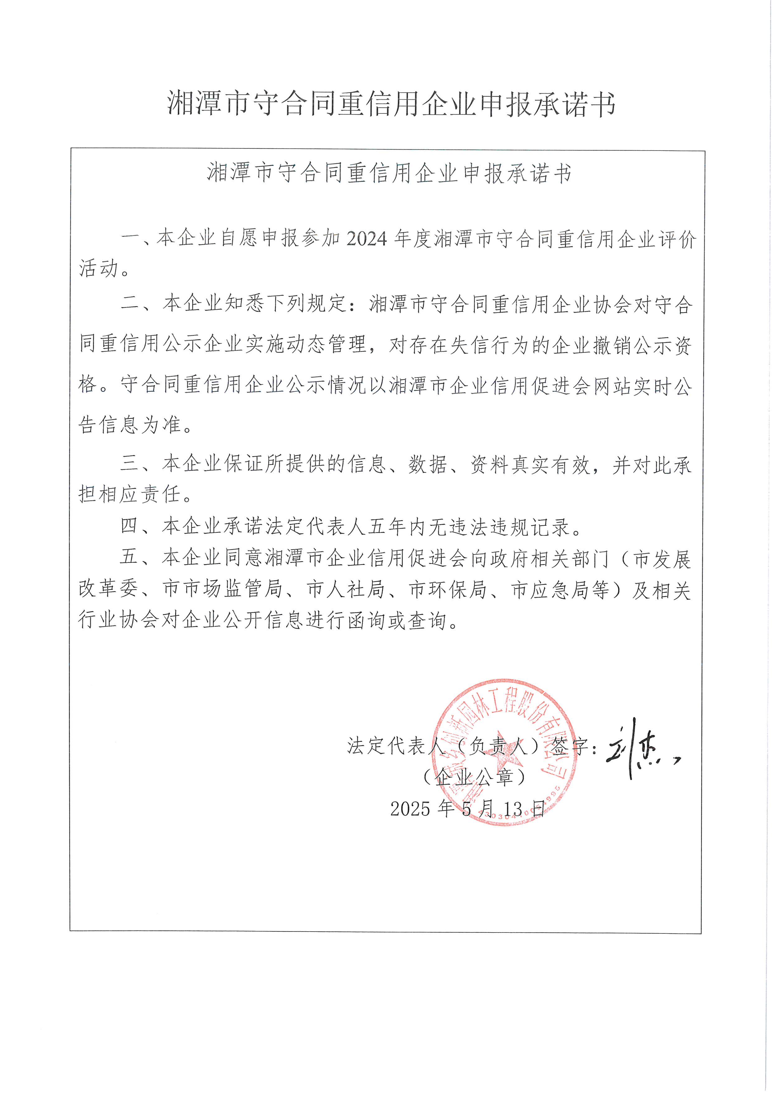 本企業(yè)根據(jù)《湘潭市守合同重信用企業(yè)申報(bào)規(guī)定》等編制 2024 年度企業(yè)信用報(bào)告書,并保證本報(bào)告書內(nèi)容真實(shí)、準(zhǔn)確、完整。