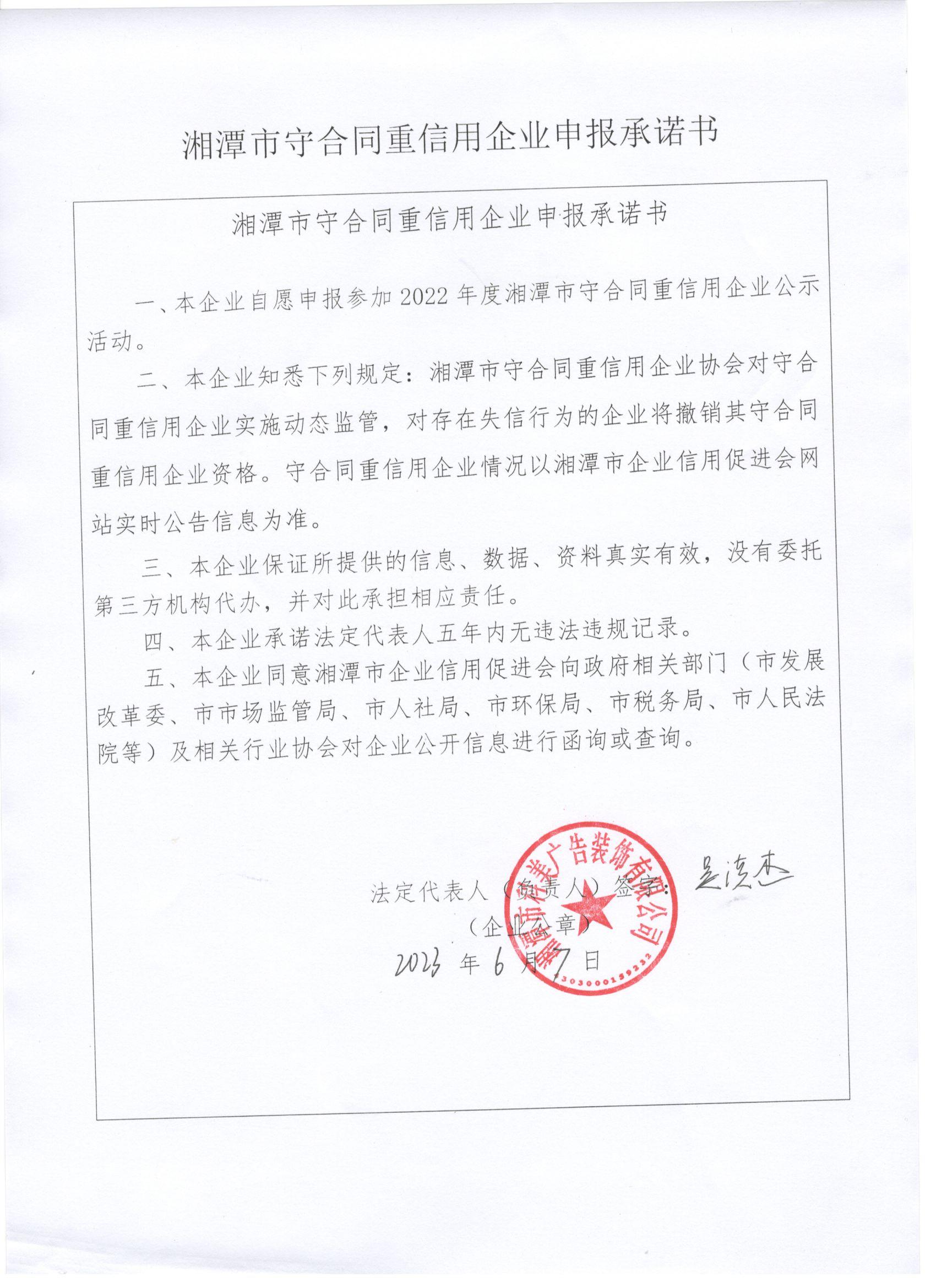 本企業(yè)根據(jù)《湘潭市守合同重信用企業(yè)申報(bào)規(guī)定》等編制 2022 年度企業(yè)信用報(bào)告書,并保證本報(bào)告書內(nèi)容真實(shí)、準(zhǔn)確、完整。