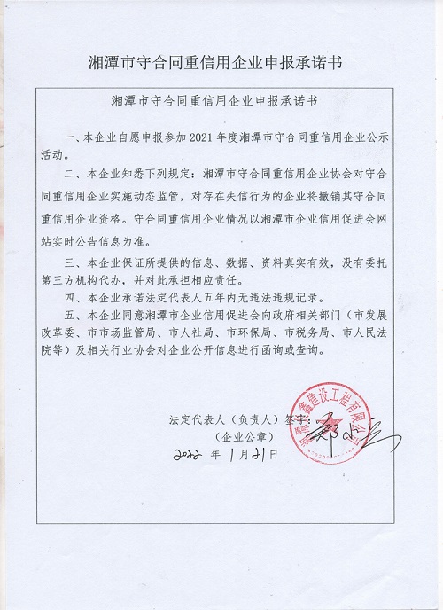 本企業(yè)根據(jù)《湘潭市守合同重信用企業(yè)申報(bào)規(guī)定》等編制 2021 年度企業(yè)信用報(bào)告書,并保證本報(bào)告書內(nèi)容真實(shí)、準(zhǔn)確、完整。